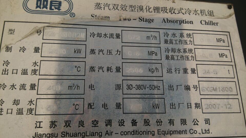 處理200萬(wàn)大卡江蘇雙良溴化鋰制冷機(jī);詳細(xì)參數(shù)SXZ6-233DHM2,生產(chǎn)日期2007年12月,制冷量2330KW,200萬(wàn)大卡,機(jī)組在位運(yùn)行,運(yùn)行狀況良好,外觀成色8成新,可質(zhì)保1年,有需要者請(qǐng)與王志高聯(lián)系;手機(jī)13861712925,13812296168(手機(jī)號(hào)碼可添加微信)有圖有真相:
